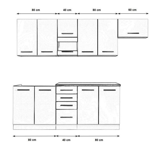• ארונות תחתונים בס"מ: אורך 2.6 מ'  גובה 82 עומק 52